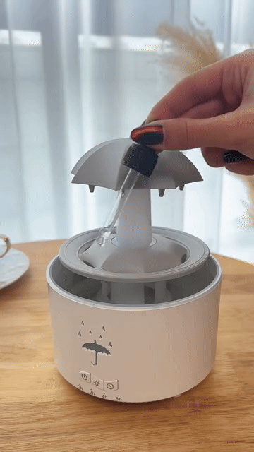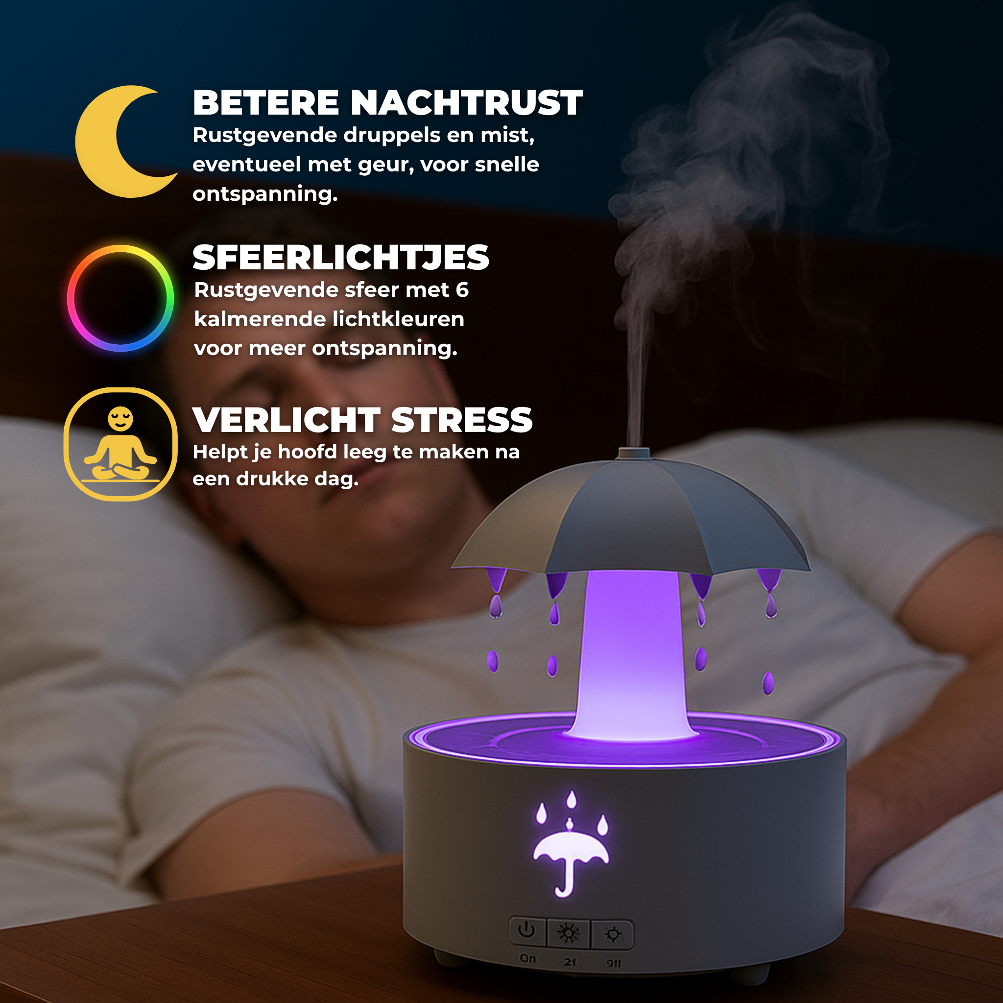 De combinatie van zachte mist, geurige oliën en subtiele regendruppelgeluiden helpt je sneller in slaap te vallen en dieper te rusten.