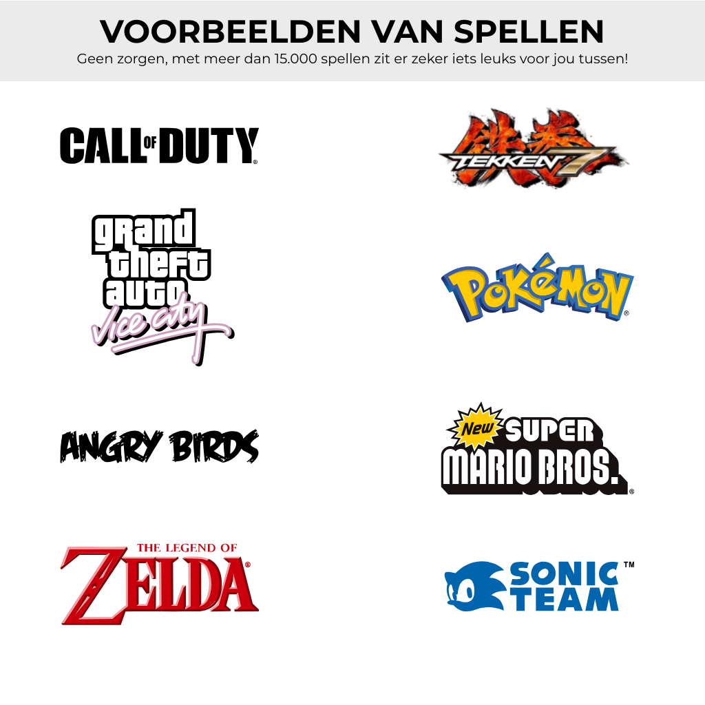 Uitpakken → aanzetten → meteen spelen. Alle games staan al geïnstalleerd en het apparaat werkt direct zonder extra instellingen.
